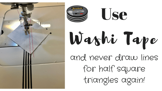 I just wanted to share one more little sewing trick today. If you’re a quilter and make lots of half square triangles, you know how time consuming it can be to draw lines on the back of squares before sewing. There are some fancy sewing machines out there that have lasers built in and they light up where you would normally have to draw the line, but I found a very inexpensive solution that has been working like a dream: washi tape! Yes, washi tape for the win AGAIN!