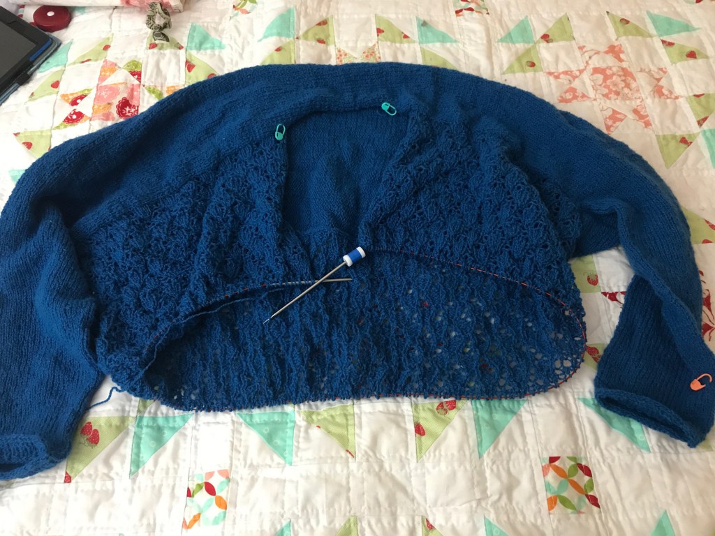 I have about 4 inches left on the body, which is taking forever thanks to the lace pattern. I’m really trying to focus on being a process knitter rather than focusing on the end result because I’m moving so slowly on this project thanks to competing demands. Plus, I’m saving a ton of money by not buying more yarn for yet another project, right?!