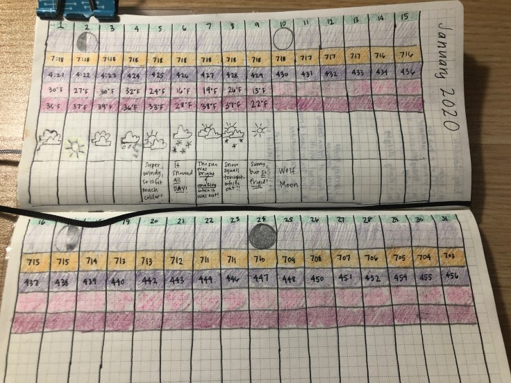 My Phenology chart has been crucial. Every day I look at how much earlier the sun rises and how much later it sets. The sun on January 31st will be out 50 minutes longer than on January 1st. 50 minutes??! Isn’t that amazing? This picture of my phenology chart is from earlier this month, but I’ll be sharing a completed picture soon — and I can’t wait!