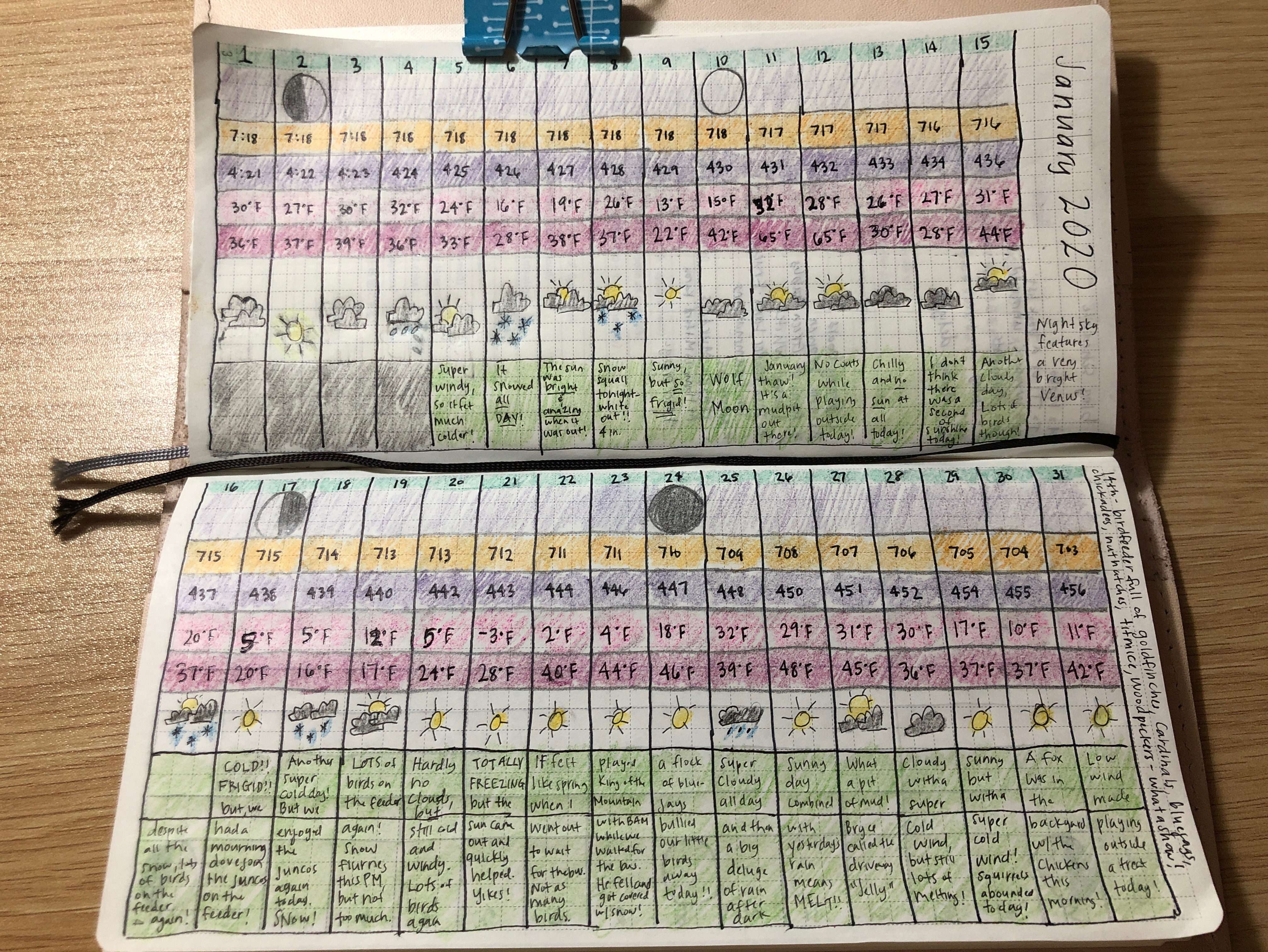 I’m using the blank pages in the back of my Hobonichi Weeks for this chart. I’m using Micron 01 pens to draw the lines and fill in dates, sunrise/sunset times, and high/low temperatures. To draw the weather and write the narratives, I’m using Pilot G-Tec-C .25 pens. To color, I’m using Crayola Twistables.