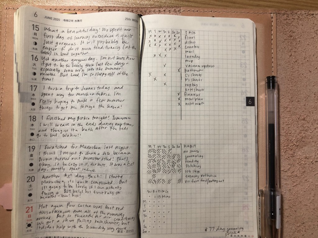 On Monday mornings I like to spend a few minutes reflecting back on the week that just ended. My trusted Hobonichi Weeks helps me with this – I use its lush tamoe river paper to track my daily/weekly tasks, my daily habits that I’m working to strengthen, and my writing time each day. On the left side of the spread, I use the dated boxes to write a few sentences about the day – it can be gratitude, gripes, or just a quick summary of something I want to remember. You might recall that I’m working hard to transition to a more plant based diet, so of course I’m using my Hobo to help get me there!