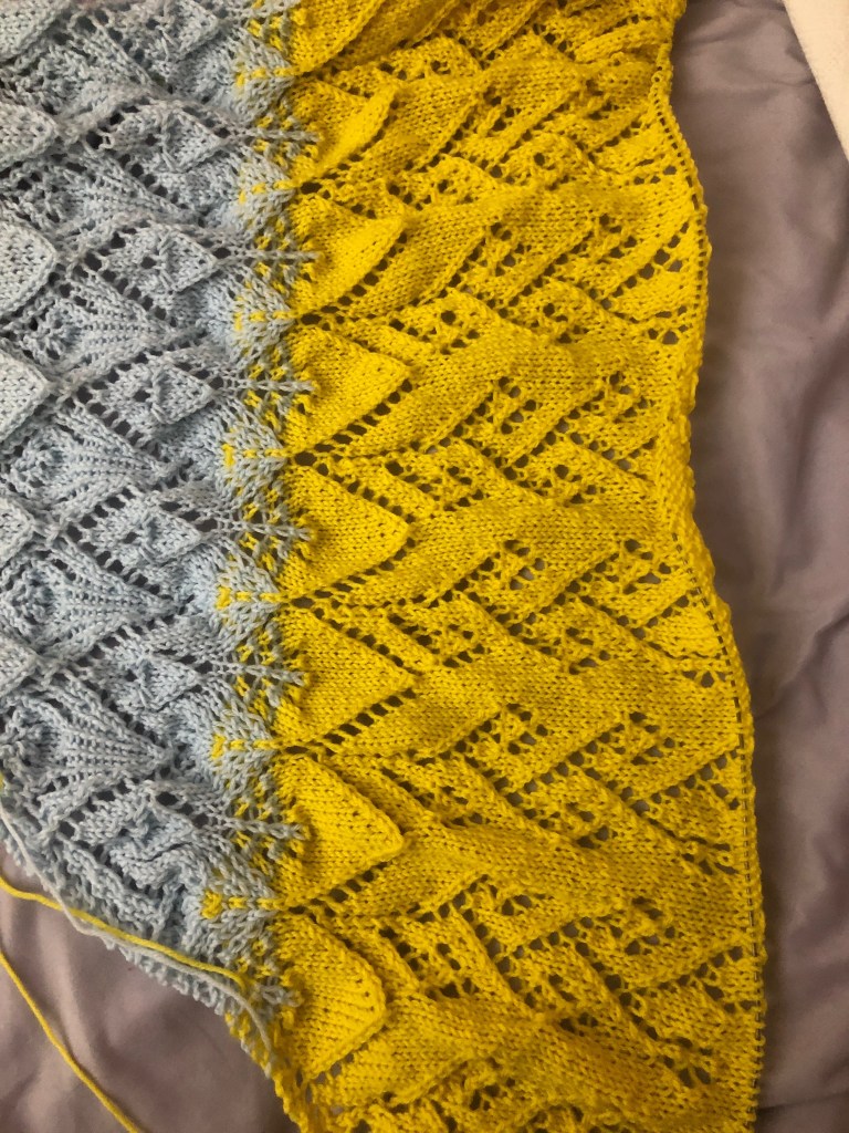 1. I love the patterns in that TTL Mystery Shawl – the gray “fronds” growing into the yellow, and I see pea vines in the yellow swirls. Very nice!