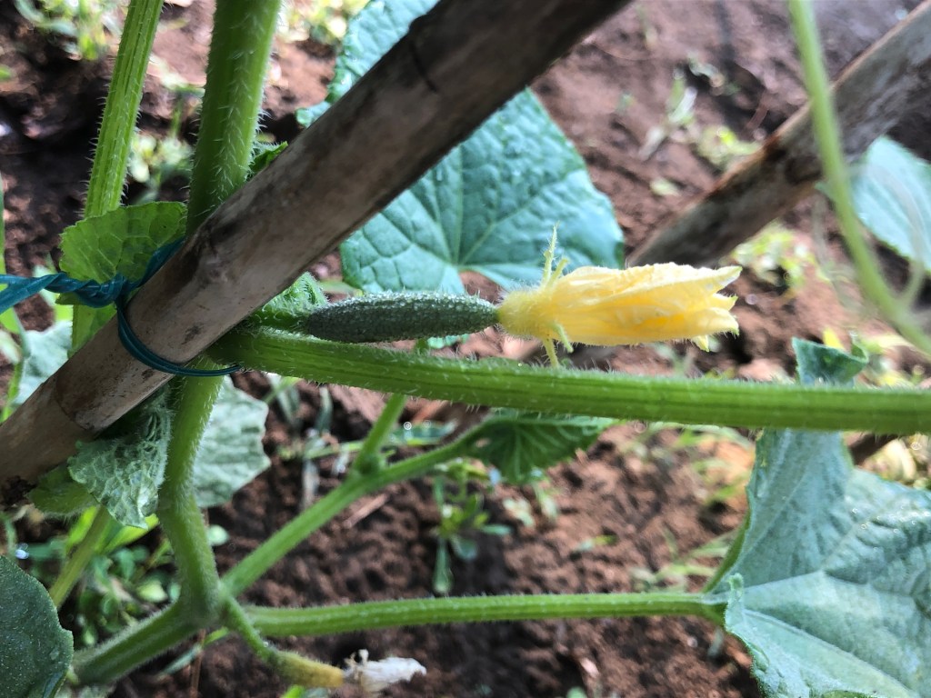 We have finished eating all of the radishes from our garden and have replaced that row with lettuces and another effort with scallions. We’ve picked a ton of peas off the vines, but we’ve eaten them all before coming inside. Now we’re eagerly watching lots of baby cucumbers, squash flowers, and a few zucchini buds. Tomatoes are plumping up, beans are starting to vine, and peppers (sweet and hot) are forming flowers. Onions are strengthening, corn is growing, and sweet potatoes are mounding. 3 varieties of potatoes are flowering and are the biggest plants in the big garden. The pumpkin patch is stretching across the side yard and the watermelons, though much smaller than their pumpkin companions, are starting to make a show. Our freshly planted wisteria is strong, the elderberry bush is taking root, and the roses keep blooming. No daylily blooms yet, but their leaves are jungle-like. Sunflowers are starting to reach up to the sky! Did I miss anything from the garden? I’m sure I did. There’s a lot happening out there! (Carrots are struggling. Beets and scallions did not survive. Not everything is rainbows and unicorns in the garden.)