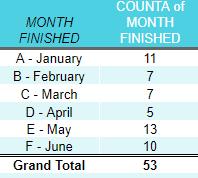 This is a new pivot table that I created this quarter. I wanted to see how my reading fluctuated by month. April was the month that I finished the fewest books (5) and I finished the most in May (13).
