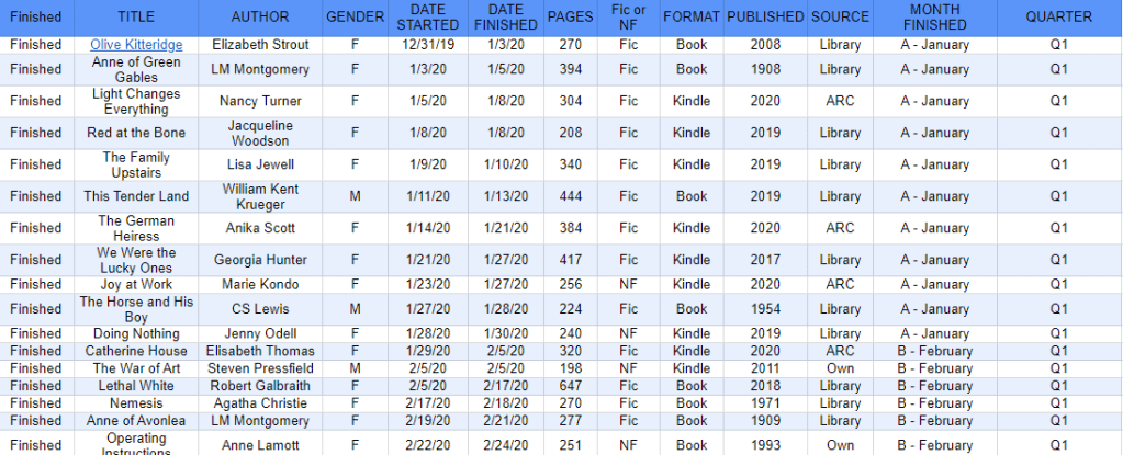I’ve already gone on and on about how this year, 2020, the strangest year EVER, has passed the halfway point. I like to check in on my reading numbers at the end of each quarter, not to push myself to read more but because I’m genuinely interested in the data. You might not know this, but I am a true lover of spreadsheets and finally began tracking my reading in Google Sheets last year, so now I have a beautiful spreadsheet full of all sorts of goodies!