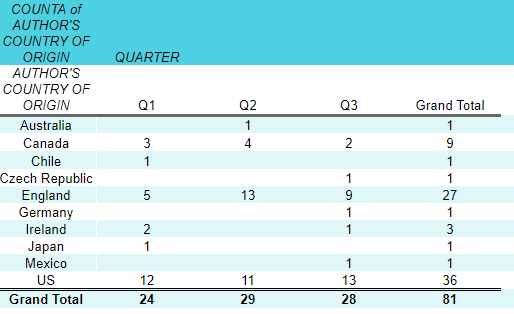 The author’s country of origin is another variable that I started tracking in the third quarter because I wanted to examine how US-centric my reading was. Over the last year I’ve read 36 US authors, 27 English authors, 9 Canadian authors, and a smattering of authors from around the world. This is just a reminder that it’s okay to wander out my own little bubble a bit more!