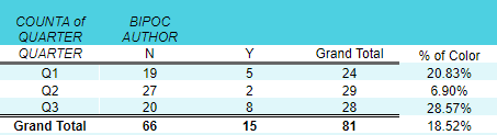 This a new variable I’m tracking – authors who are Black and Indigenous People of Color. I think I’m doing fairy well in this category. Overall, 18.5% of the authors I’ve read this year have been BIPOC. The second quarter was quite low (6.9%) because I was bingeing cozy murder mysteries by Elly Griffiths and Ann Cleeves. This past quarter was definitely the highest and I attribute that to all of the social unrest in the US right now.