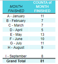 This is simply a quick snapshot of the number of books I finished each month. It’s helpful when I’m writing posts for monthly highlights and it gives me a general idea about how my reading fluctuates. As of the end of the third quarter, I had finished 81 books! My lowest point was in April – the first full month of quarantine. My reading quantities peaked just afterwards and have now fell back to a more reasonable rate.