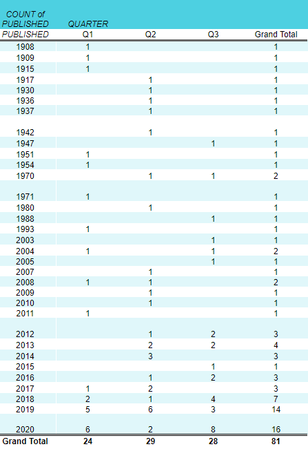 Just another fun graphic to see the spectrum of books I’m reading – this time by publication date. I’ve read 30 books that were published in the last two years (2019 and 2020). I’ve read something from every decade since the 1900s, except for the 1920s and 1960s. How cool is that?! Maybe I should be on the hunt for books published in those decades for the next quarter so that I can complete the century+? That sounds like a fun mini-goal for the rest of the year! (Okay, I already have them both picked out: The Great Gatsby from the 20s and A Wrinkle in Time from the 60s. Planning is done; time to execute.)