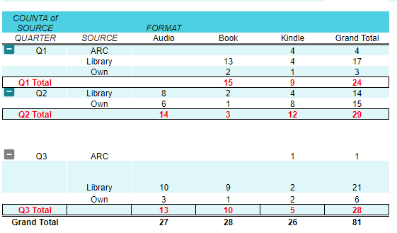 This a complicated graphic, but I like it because it tells me the format (audio, physical books, or kindle books) of the books I’m reading, along with their sources (Advanced Reader Copies, the library, or my own bookshelves). I also love that it’s broken down by quarter. For simplicity’s sake, I’ll just write about the third quarter: