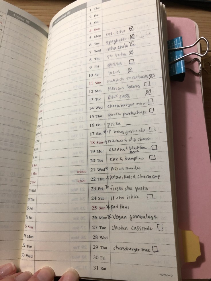 The meal plan is still working quite well. We stopped for fast food on Saturday when we took a drive up to the mountains, but thought of it as more of a treat than a necessity. And I had dinner ready to eat when we got home later that day (chicken tikka masala), which felt really good. I’m so pleased with how this is working out and am feeling excited about planning for November. I love that I don’t have the daily panic of figuring out dinner – it makes such a difference.