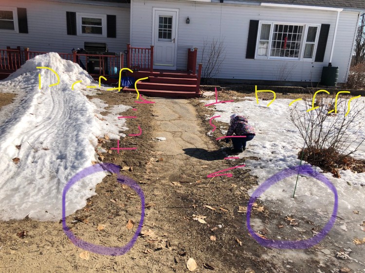 I took this picture yesterday and marked it up to show you where things are planted. The purple circles on the bottom of the picture show the crocus beds – as you can see, the left side is starting to dry up and the right side is still covered in ice.