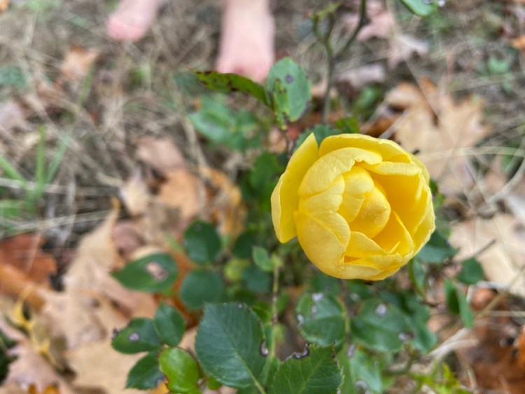 Somehow this yellow rose has kept itself intact (and the blurry bare feet in the background simply refuse to be shoved into shoes).