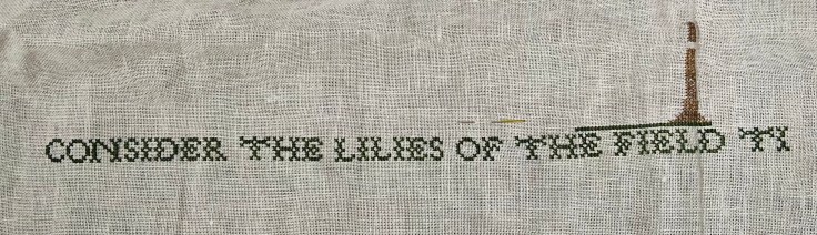 Consider the Lilies is my Sunday Stitch. It’s on 28 count linen, which takes some getting used to after the 36 counts I’ve been stitching on. The pattern calls for one strand of floss for each stitch. I tried that on the tree (the brown bit on the far right in this picture) and didn’t like the fill at all. So when I got down to the text, I tested 2 strands to see what it would look like. Much better. The problem, of course, is that I’ll go through twice as much as thread.