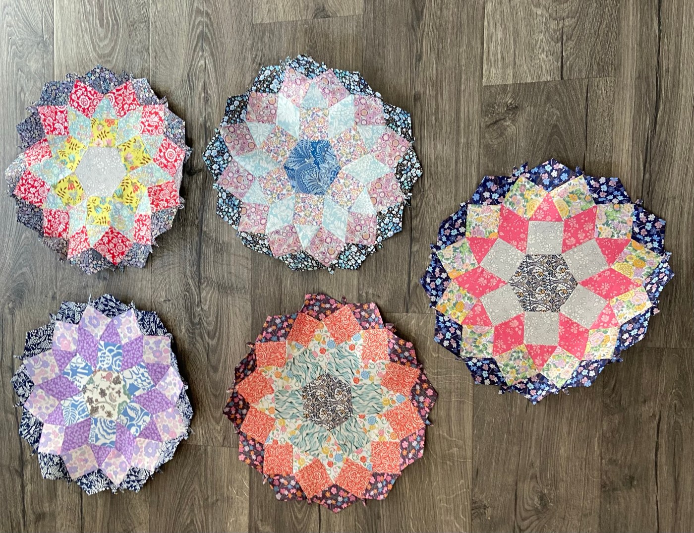 Here are the other five blocks I’ve completed (unpressed!). Just a reminder: I’m aiming to sew this entire quilt in Liberty Tana Lawn fabrics (my current favorite US source is DuckaDilly). I can’t even. Not only does the fabric feel fabulous, but I’m of the opinion that no one does florals like Liberty. And I love mixing and matching florals all day long! I’m doing the outer ring in darker shades because the joiner blocks are going to be light colors, so the main blocks will really pop next to them.
