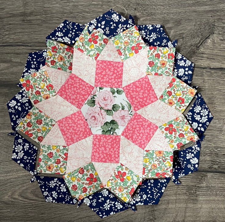 This is where I am with my sixth Mandolin block. I still need to stitch on the final round but I’ve included those shapes in this picture so you can see what it will look like. This is my favorite one yet (I think I say that about all of them.)
