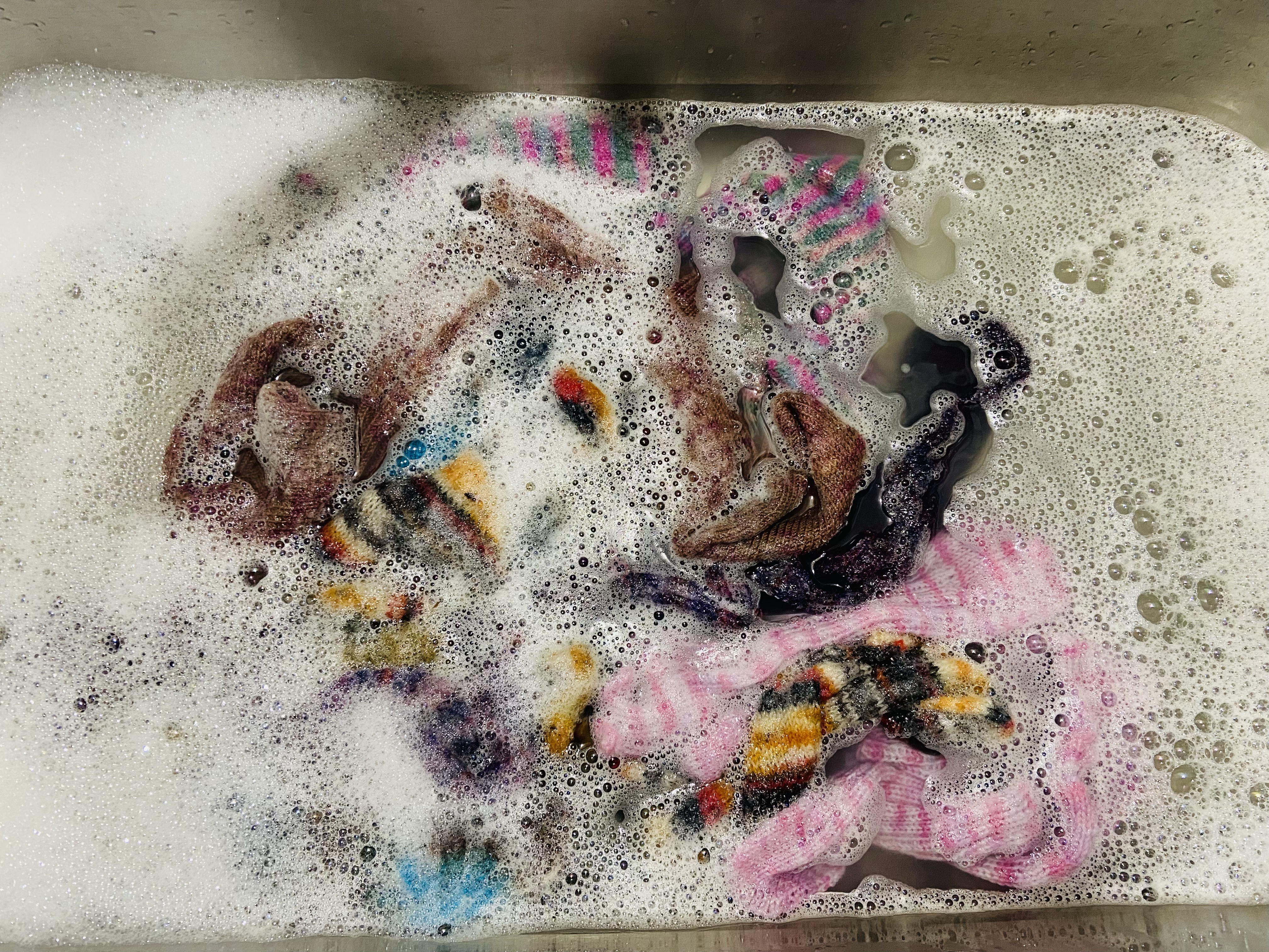 I finished a pair of socks earlier this week that needed to be washed and blocked, so I decided to throw a whole basket of dirty socks into the sink. I love seeing all of those colors and patterns all swirled together in the bubbly water! Of course, I have a new pair of socks on the needles. This time I’m knitting up a pair of SOHCAHTOA socks (Ravelry link) by the lovely Sarah at PAKnitWit. This is such a clever pattern! The method for knitting the gusset and turning the heel is the same whether you knit toe up or top down. I’m a toe up knitter myself, but am planning to do one sock my typical way and the second from the top down, just to help prove her theory. I turned my first heel last night; so far, so good!