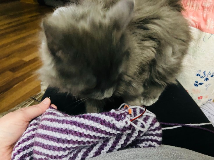 I took this picture last night. Seconds after snapping it, her paw got caught in my knitting cord and she slipped a needle out of half of the stitches. Between the kids and the cats, I am getting a lot of practice picking up stitches lately!! I fixed it and there’s only a tiny bobble of a mistake that’s visible – whew.
