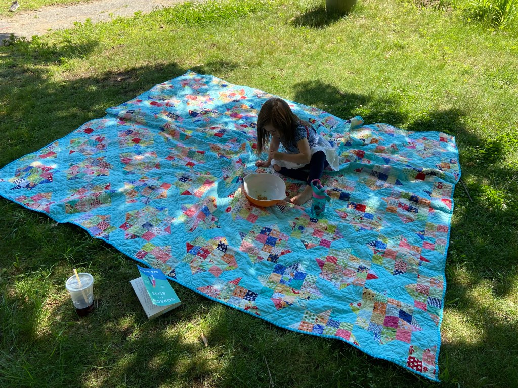 Dare I say it? The weather was perfect this week. The high has been in the very low 80s, the low has been in the low 50s. Each afternoon we’ve spread out the quilt and played until it was time to go in and start the evening meal. Saturday’s forecasted high? 58*F!! I will take it.