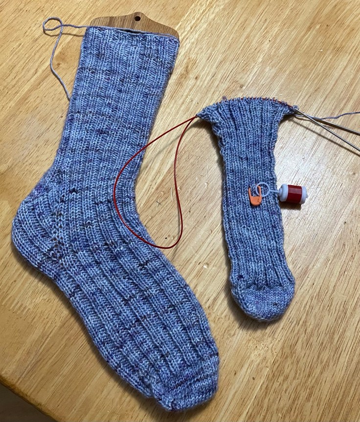 My most recent pair of DRK Everyday Socks are much more convenient to pick up/put down. I finished the first sock last Friday while lazing on the couch with Grantchester and was smart and immediately started the toe of the next. I’ve finished the increased gusset and hope to turn that heel tonight so that it becomes mindless again. I’m anxious to finish this pair so that I can cast on with the yarn that Sarah sent me. I’m petting it as I type this!