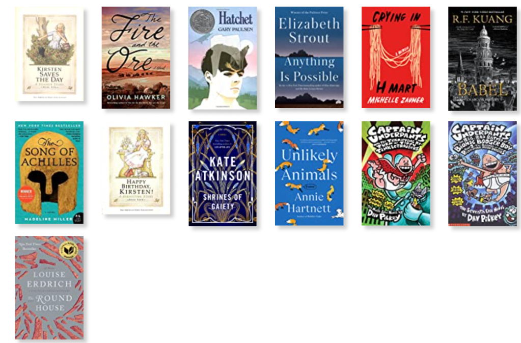 Kirsten Saves the Day | The Fire and the Ore | Hatchet | Anything is Possible | Crying in H Mart | Babel | The Song of Achilles | Happy Birthday Kirsten | Shrines of Gaiety | Unlikely Animals | Captain Underpantsx2 | The Round House