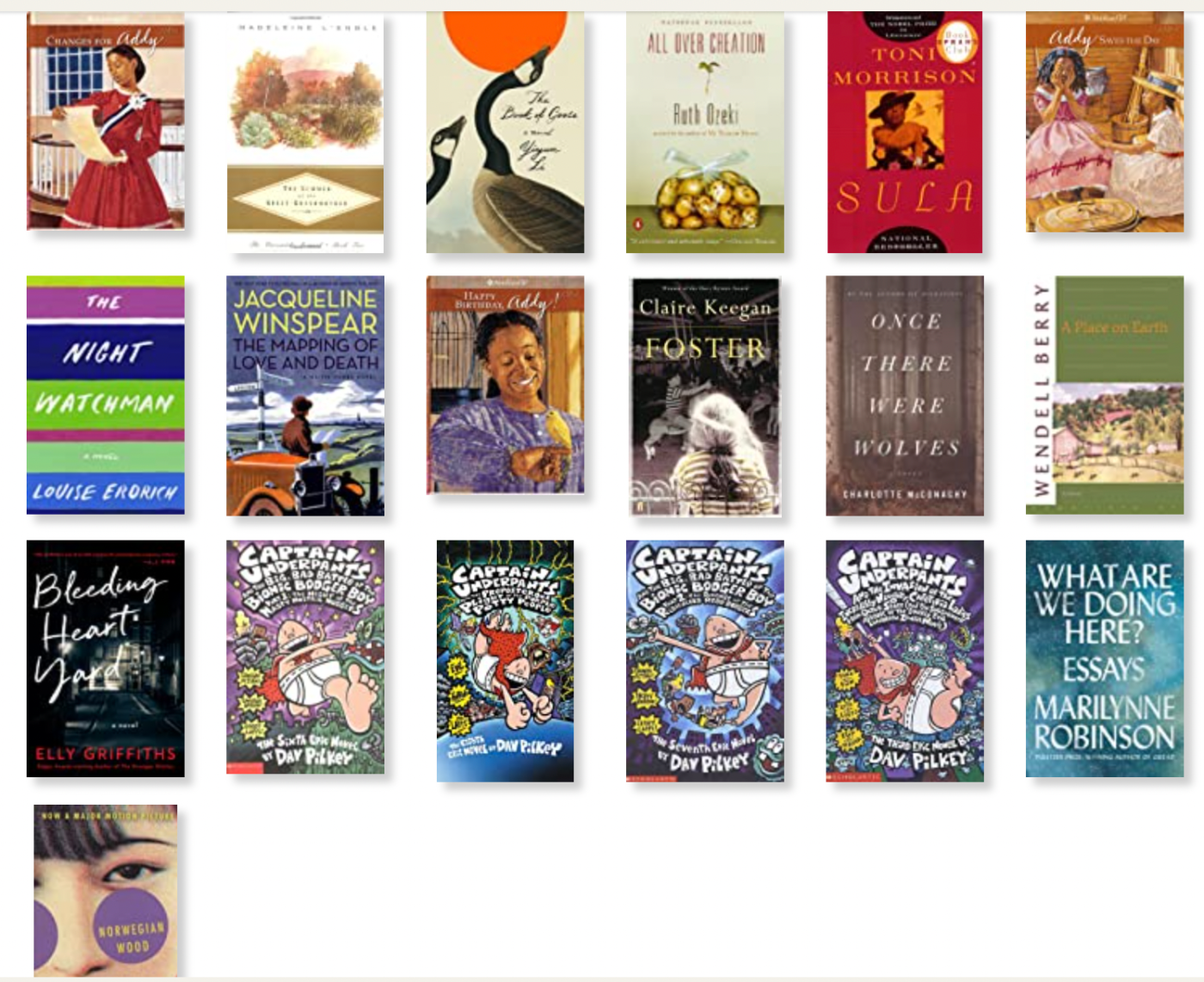 Changes for Addy | The Summer of the Great Grandmother | The Book of Goose | All Over Creation | Sula | Addy Saves the Day | The Night Watchman | The Mapping of Love and Death | Happy Birthday Addy | Foster | Once There Were Wolves | A Place on Earth | Bleeding Heart Yard | 4 Captain Underpantses | What Are We Doing Here? | Norwegian Wood
