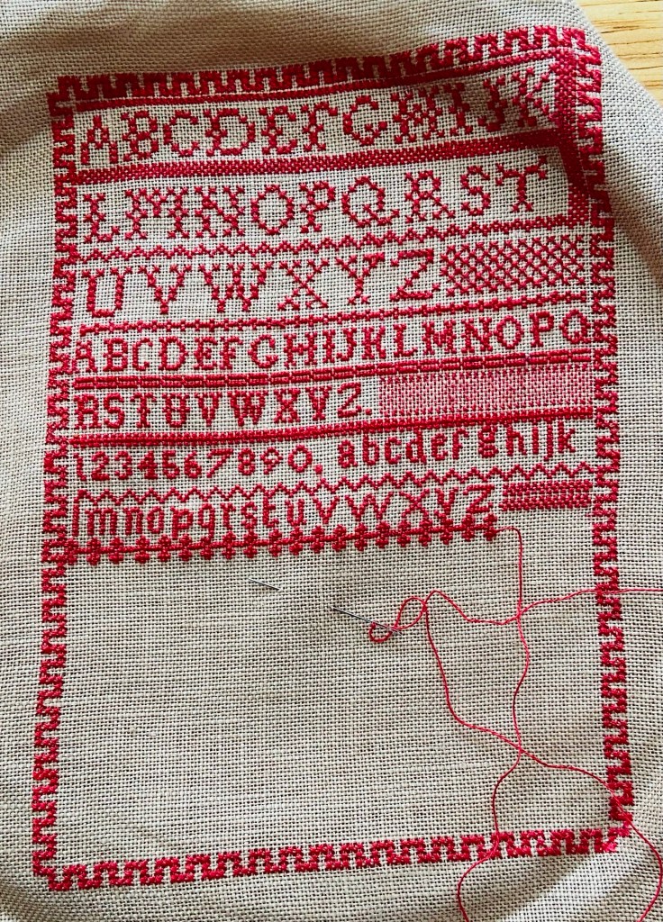 This is considered a “small” cross stitching project but has now taken me over a year to get this far. Other than the border and the top alphabet, all of the stitching is over one thread of linen, so these stitches are very tiny and I have to take a lot of deep breaths as I go along. But my goodness – I am so proud of how well this is coming along.