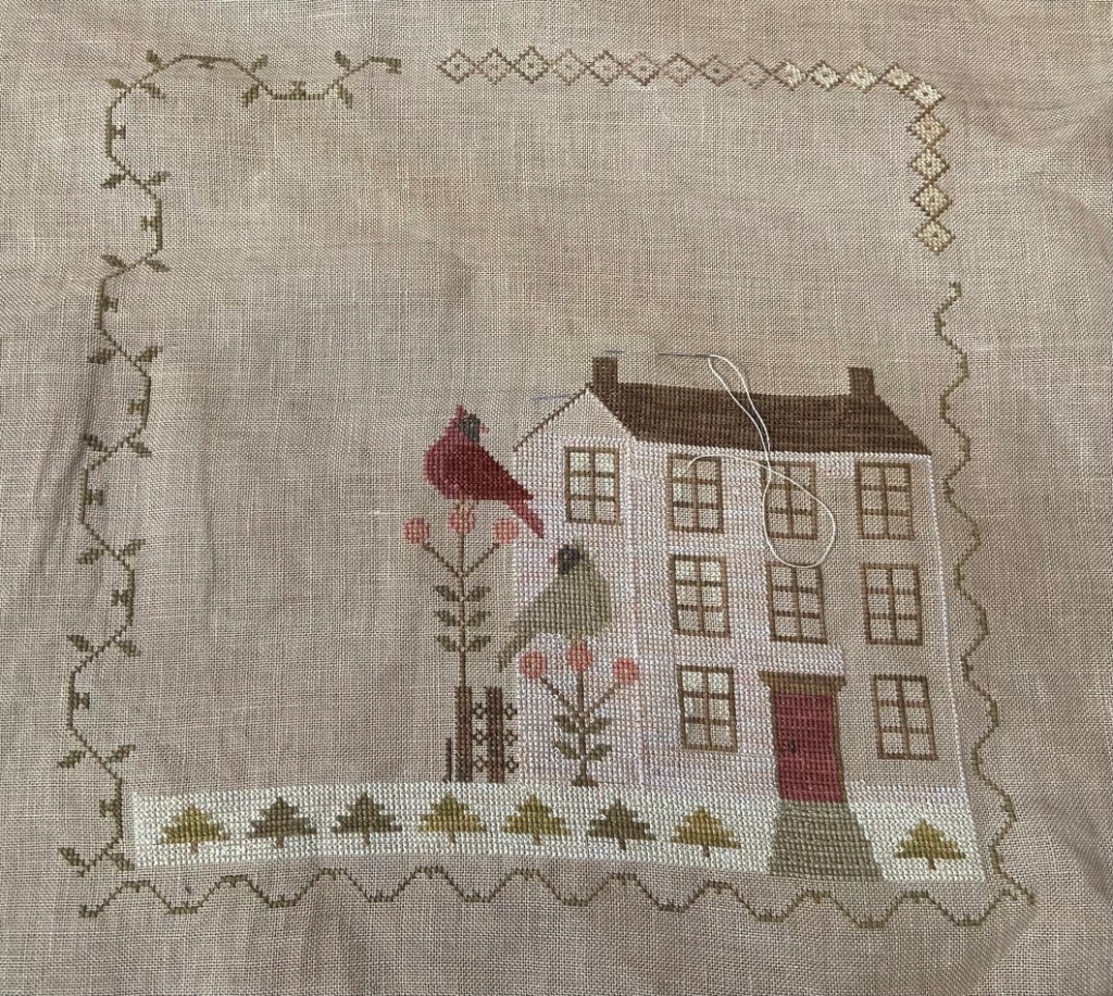 And of course – I’m always looking ahead to my next project. Once I finish Annie Bayliss, I’m going to work on finishing Winter Rose Manor. Because I’m such a painfully slow stitcher, I’ve decided that seasonal stitches aren’t a good idea for me. I’ll never have enough of any season to make it worthwhile to switch around displays. My goal is to have projects that feature birds, bees, and flowers — all spring related themes. So I’m not going to add any of the falling snow that’s in this design and instead, I’ll think of this one as a transition to spring. Because look at that pair of cardinals!