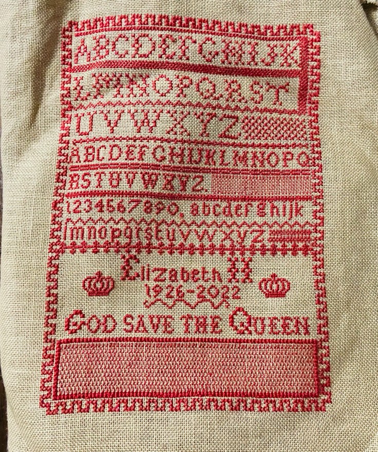 I began this sampler on January 1, 2022 with the full intention of finishing it by the Queen’s jubilee that summer. By June, I was nowhere near finishing it. When the Queen died in September, I decided to dust off this project and to sketch out a dedication to her. I found the pattern for the crown motifs in this free download from Hands Across the Sea.