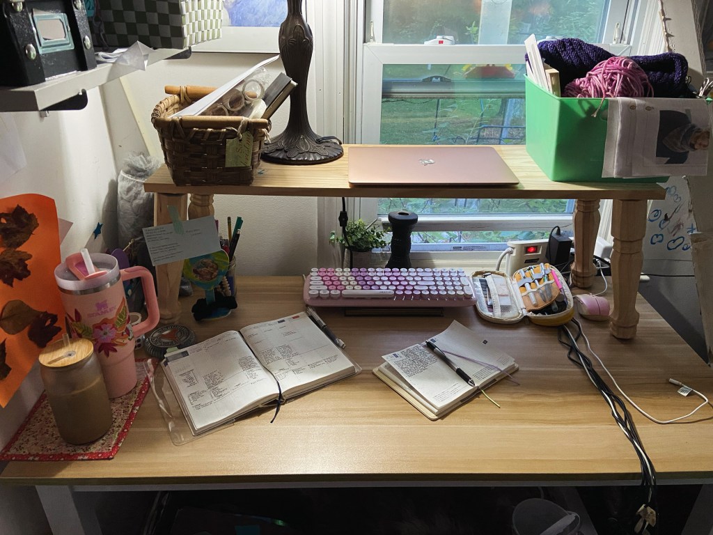 Last week I gave myself a goal to clean up this space. This is as far as I got and still – I’m pretty happy with it. There’s room for my notebooks, stationery supplies, and drinks. The cords will be dealt with another day (with a little bit of luck) but they’re not really in my way when I’m journaling or typing, so I’m going to call this a major win. Even better: my desk has stayed in this condition for almost a week. Win #2!