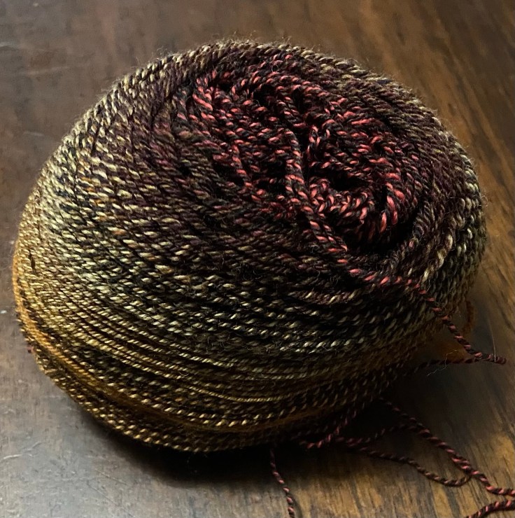 This is what’s left of a hank of Sarah’s handspun that she sent me almost two years ago. I used a small chunk of it for my Tessellated Vest last Thanksgiving and want to use the rest of it in a colorwork sweater this winter. This yarn is fingering weight and I’ve been looking through Jennifer Steingass’s patterns on Ravelry, so I’m thinking either Norwood (Ravelry link), Goldenfern (Rav link), or Anaashah (Rav link).