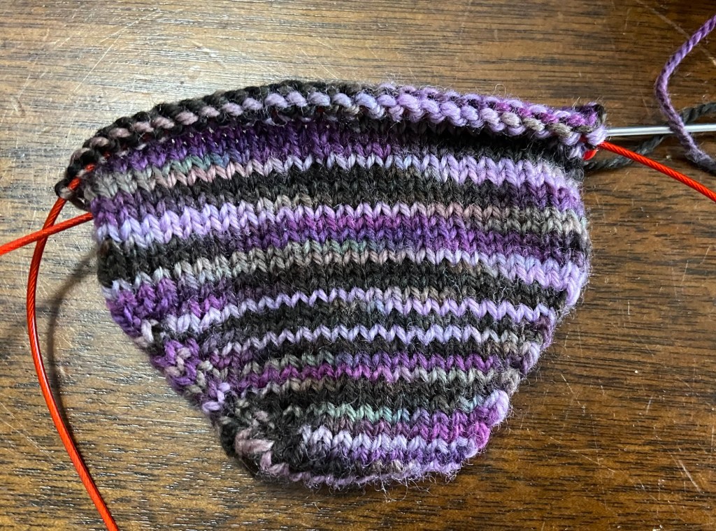 I opened my first “sock club” package this week. I was delighted to find an ancient skein of Lorna’s Laces, which I’ve had for at least 15 years at this point? This yarn is shepherd sport and I only had one skein in my stash – not ideal for a pair of socks. I also remember there being a issue with color pooling in Lorna’s Laces? And still – I’m doing this because I want to use up my stash even if the projects aren’t perfect. So my kitchen scale helped me divide this into two balls and I’ll make toe up socks and knit until each ball runs out of yarn. As long as I get past the heel then they should be good enough and they will be roughly the same size. My strategy is working so far: