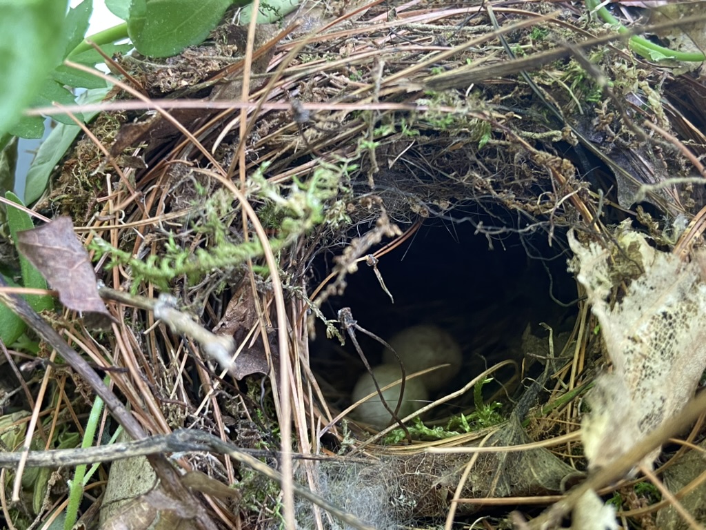 The opening picture is of a bird’s egg that Dawsey found on the ground on Sunday. I found an old picture of the nest the Carolina Wrens built in our window box last summer: