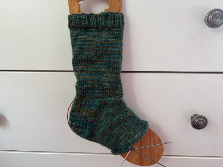 I have not worked on my sweater at all this week, so no progress pictures to share. But I have made progress on my sock! I typically work on this while the kids are busy writing or doing math; it keeps me from helicoptering and doing the work for them. Also, I have a rule that I finish a side before I put it down, so they have to wait a bit if they need help and I’m in the middle of a row… which is usually just enough time for something to click for them and they work through the problem themselves. It’s been a revolutionary tool for us.