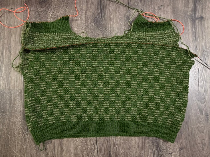 This week’s goal was to knit four rows a day on my Lettuce Mint sweater — well, I didn’t knit four rows every day but I did average a little more than four rows a day, so I’ll call it a success. I have about 20 more rows before I switch to ribbing needles and start the back shoulder ribbing. Here’s a link to my Ravelry project page for a refresher on the yarn details and pattern information. This week’s goal: stick to 4 rows a day.
