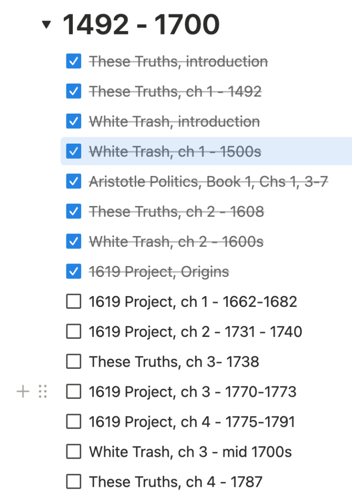 This week I finished the second chapter of White Trash and started the 1619 Project. White Trash answered a big question that bubbled up for me in the second chapter of These Truths: John Locke was virulently anti-slavery but wrote slavery into the Carolina Constitution as secretary of the charter. Why? Well — because he was a founding member and the third largest shareholder of the Royal African Company, which had a monopoly in the British slave trade. Money corrupts everything! I also read more about the splitting of North & South Carolina as well as the founding of Georgia. You can really see the intersection of race and class in this chapter and how the stage is being set for poor white settlers to see slaves as their competition. (Much like the arguments we hear about immigrants competing for jobs today.)