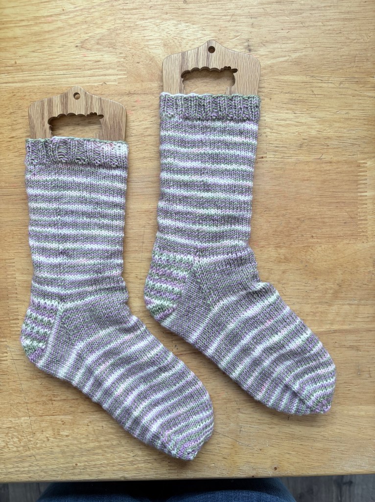 I finished those sweet pea socks early in the month! This is before washing and blocking (which I still haven’t done) and I still haven’t been able to accurately capture the pinks and greens in this colorway. Oh well.